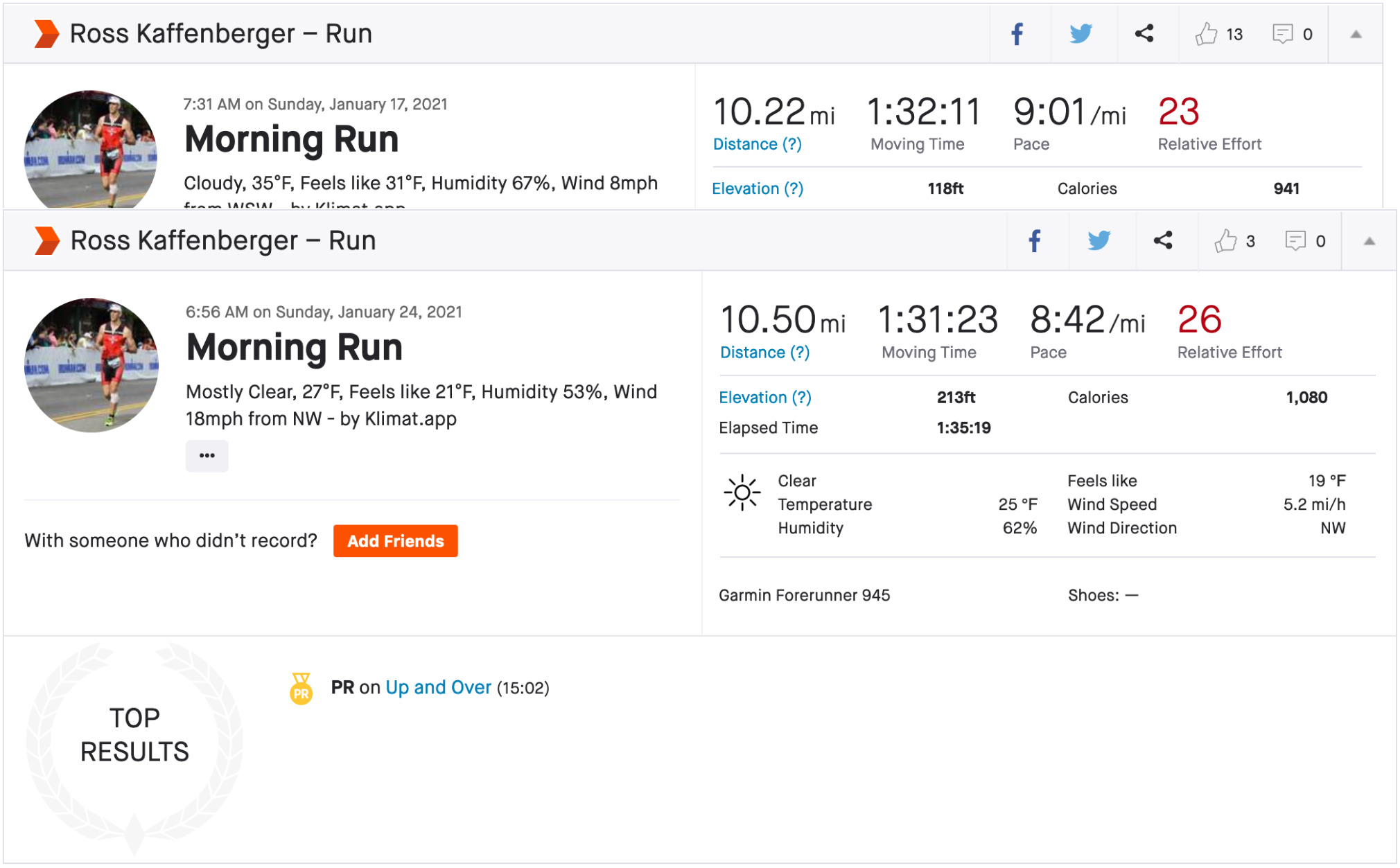 On the other hand, I wasn’t able to do my Saturday bike ride this week, so it’s possible I had a less fatigue in my legs. I recall feeling pretty good out of the gate last week, but ended up feeling nauseated throughout the latter half. Today I felt really sluggish to start out—this despite getting decent sleep and eating relatively clean over the past few days—but, both literally and figuratively, got my second wind late in the run. All this to say, it’s difficult to draw conclusions about why one week I was 20 seconds faster per mile which may be due only partly to circumstances under my control.